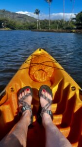 This was advertised as a leisurely 2-mile paddle upstream on the Wailua River which we found 2 miles to be very strenuous if you don’t kayak often or at all. Once you get to the shores of the North Fork you have a moderate to strenuous 1.5-mile hike to Uluwehi Falls, a.k.a. Secret Falls. This trail is slippery and very rocky making walking difficult. There are stream crossings that weren’t deep when we were there, but again, difficult to walk on the uneven, slippery algae-covered rocks.