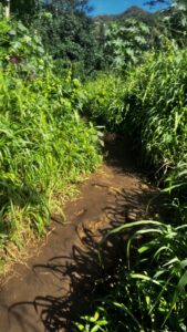 The hike switches from the coast to the valley where you will cross freshwater streams. Now your view is obstructed with a jungle of vines and varied Ti plants.  Walking is difficult since your goal is to remain upright. A feat. I had good hiking shoes and a hiking stick, and I still struggled not to slip and fall. We lucked out since it had not rained therefore the trail wasn’t muddy the entire hike or as muddy as it usually stays. But there were still steep areas that weren’t dry and slippery. I never got pictures of these areas since I was just trying to stay upright and not fall.