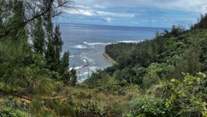 The trail starts with a steady 400 ft ascent. The trail is very, very muddy and slippery, even when it hasn’t been raining. The mountain always has water seeping from the rocks and crossing the trail. There are a lot of jagged rocks you must navigate beneath your feet so make sure you have good hiking shoes and a pole. When your reach the first mile you will have a vista with views of the Na Pali coastline which is beautiful.