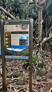 The Kalalau Trail starts at a trailhead located at Ke’e Beach in Ha’ena State Park. The trail is about a 4-mile out-and-back hike to the Hanakapi’ai Beach. Note in the picture all the warning signs. Maybe we should pay attention to them.