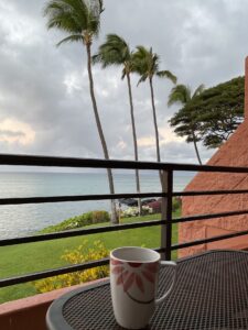 Our good friends, Jerry and Clara were already in Maui when we arrived. Clara always stops at Costco by the airport for groceries. I wasn’t cooking this trip, but do enjoy my coffee in the morning, especially on the balcony. Clara made sure we had the essentials for our mornings. What a good friend.