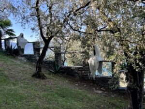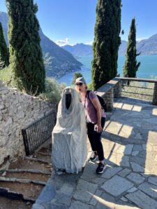 A steep stony trail with 580’ elevation gains to reach a ruined Medieval castle dating to Roman times (30 minutes climb more or less). The 3-mile round trip hike is well worth the effort. Beautiful views of Lake Como and Varenna. The castle has Paper-Mache ghosts along the stone wall.