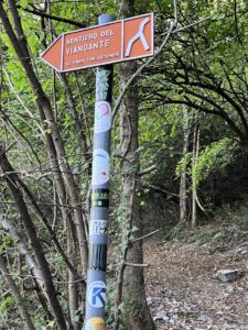 Since we had hiked up to Castello di Vezio, we decided instead of hiking back to Varenna we would take the Wayfarers’ Path to Bellano and have lunch. As you descend from the castle pick up the Sentiero Del Viandante track north. There are some steep trails, but they are well maintained. Bellano is about 3.5 km away. There are stunning panoramic views of Lake Como along the way. An old church, olive groves and small streams are things you will see along the Path of the Wayfarer. Look for and follow the sign with this symbol: