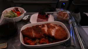This was as close to first class as we’ve ever experienced flying. Tablecloth on our tray, oversized seats that had an adjustable footrest, padded headphones, tasty food served on real plates and free wine.