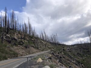 After checking in early, we drove into the park and explored the area. We used our Gypsy Guide app to help orient us inside the park. A heads up: there are a lot of burn-scar areas and beetle-kill dead trees. I was shocked and saddened to see these areas inside the park.